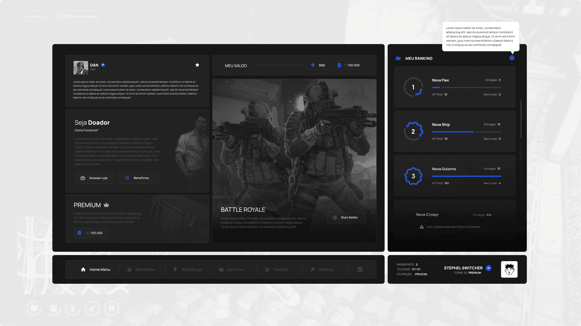 A reimagined ESC menu built for clarity and immersion. It includes access to identity, rules, support, and settings, with smooth transitions and a neutral visual style optimized for performance.