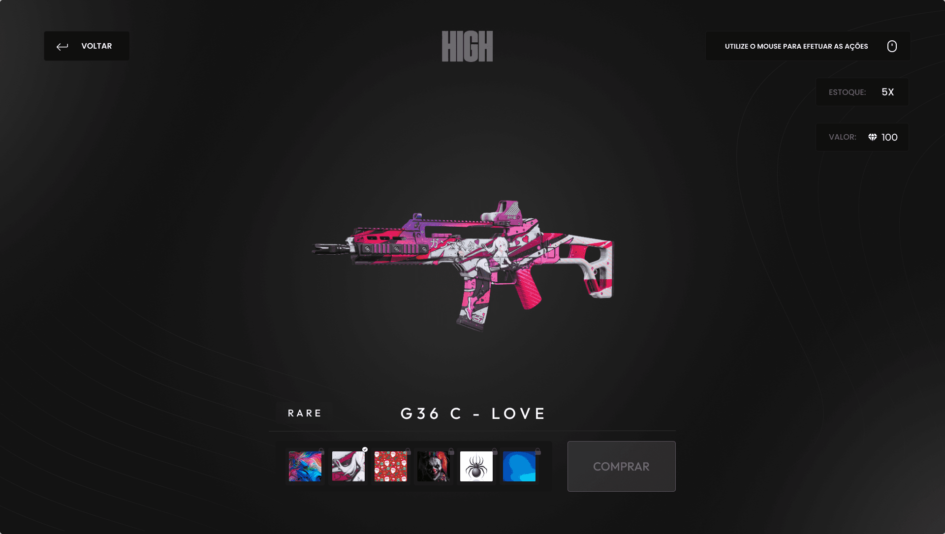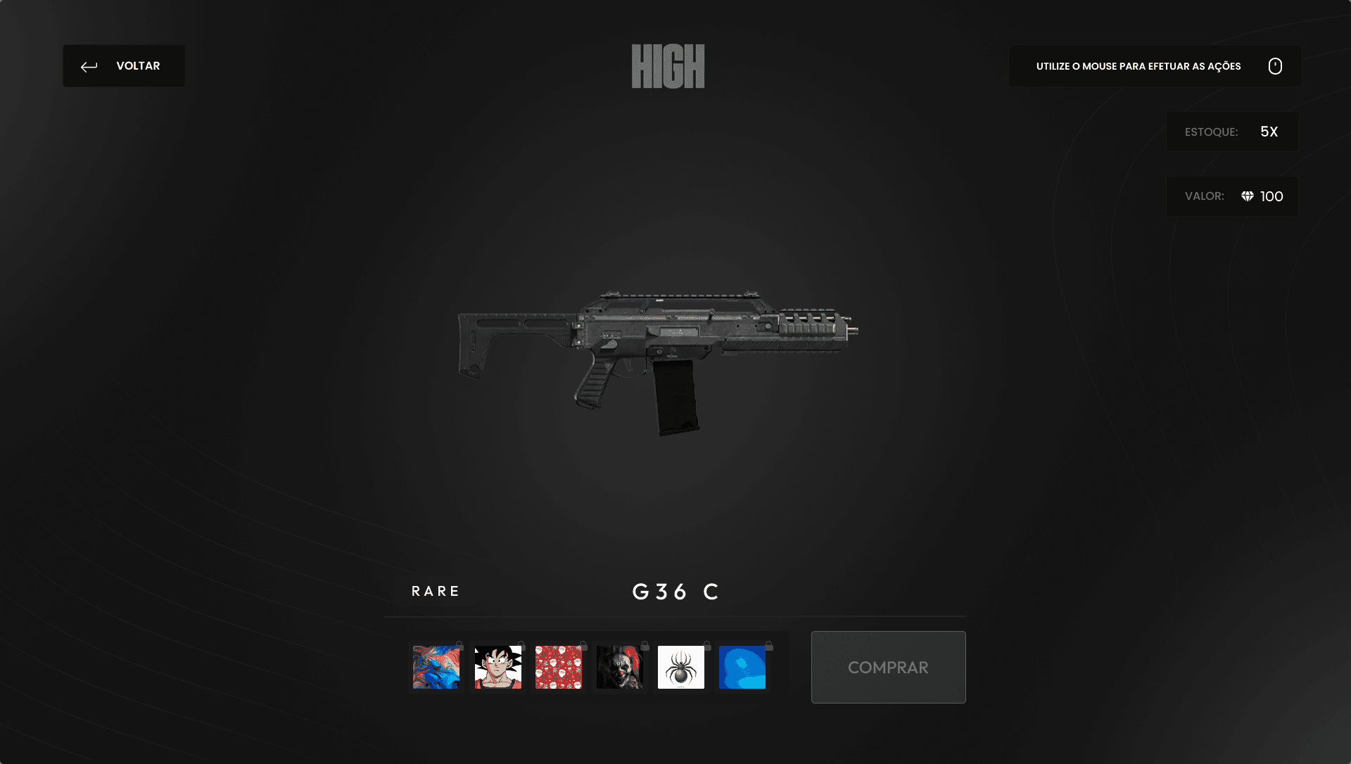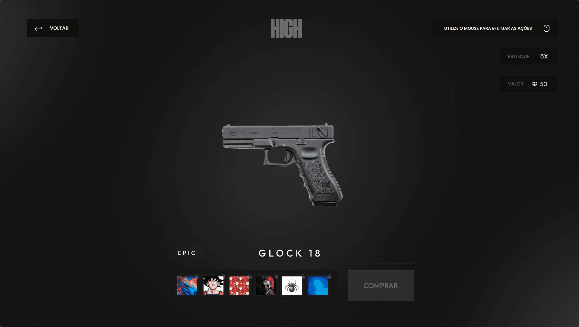 An in-game weapon skin store powered by gem currency. Players can preview, buy, and equip skins through the inventory. Designed to increase engagement and monetization in the High City server.